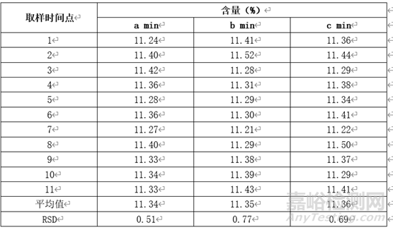 考察1:預混合階段混合a min、b min、c min后取樣檢測混合均勻度。考察結果見下表。