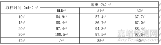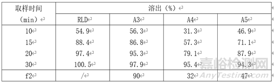 考察2:加粘合劑階段,A1、A2批粘合劑液體用量分別為800g、1200g,考察其溶出。考察結果見下表。
