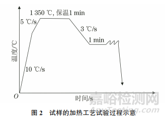 高溫拉伸試驗(yàn)溫度為600~1350℃,每次試驗(yàn)的溫度間隔為50℃,試驗(yàn)過(guò)程中采用氬氣保護(hù),可以防止氧化。在拉伸過(guò)程中,試樣的應(yīng)變速率參照實(shí)際45鋼連鑄坯的應(yīng)變速率進(jìn)行設(shè)定,選用的應(yīng)變速率1×10-3s-1。為了保證試樣溫度的均勻性,先以10℃/s的升溫速率將溫度升高到1200℃,再以5℃/s的升溫速率將溫度升高到1350℃,保溫1min,然后以3℃/s的降溫速率將溫度降到預(yù)定的測(cè)試溫度,保溫1min,以1×10-3s-1的應(yīng)變速率拉伸試樣,直至試樣斷裂。試樣的加熱工藝試驗(yàn)過(guò)程如圖2所示,試驗(yàn)后計(jì)算其高溫抗拉強(qiáng)度和斷面收縮率,并借助光學(xué)顯微鏡、掃描電鏡及能譜儀對(duì)斷后試樣的微觀形貌進(jìn)行分析。