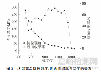 2.1 45鋼連鑄坯的高溫抗拉強(qiáng)度極限及斷面收縮率