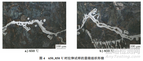 用光學(xué)顯微鏡對(duì)拉斷的7根45鋼連鑄坯試樣進(jìn)行觀察,發(fā)現(xiàn)試樣中均明顯分布著 MnS夾雜。將試樣用體積分?jǐn)?shù)為4%的硝酸乙醇溶液腐蝕后,發(fā)現(xiàn)鐵素體沿原奧氏體晶界析出,形成鐵素體網(wǎng),MnS夾雜集中分布在鐵素體相中,同時(shí)伴隨出現(xiàn)了橙色的多邊形碳氮化物,沿夾雜相可見(jiàn)明顯拉伸開(kāi)裂。650℃和850℃時(shí)拉伸試樣的顯微組織形貌如圖4所示。由圖4可知:45鋼連鑄坯的原始晶界上明顯有MnS夾雜偏聚和碳氮化物析出,降低了鋼的塑性。在拉伸過(guò)程中,試樣在較低的變形程度下發(fā)生了斷裂,因此在溫度為600~900℃下試驗(yàn)所得試樣的整體斷面收縮率較小。
