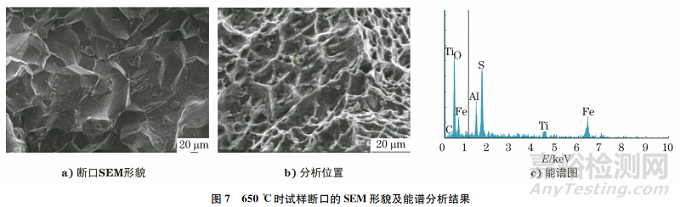第二類為脆性溫度區(qū),即低溫區(qū) (600~900℃),通過(guò)觀察,低溫?cái)嗫诔?ldquo;冰糖”狀,呈沿晶脆性斷裂特征,晶粒間有開(kāi)裂和微小的孔洞。造成這種斷口的主要原因是低溫奧氏體發(fā)生相變析出薄膜網(wǎng)狀鐵素體,鐵素體強(qiáng)度小于奧氏體,在變形過(guò)程中出現(xiàn)不均勻變形,易在鐵素體上形成裂紋;在奧氏體晶界上析出的鐵素體中分布著長(zhǎng)條狀MnS夾雜,拉伸過(guò)程中試樣易沿著夾雜物發(fā)生開(kāi)裂;在低溫區(qū),晶界上有釩、鈦、鈮的碳氮化物析出,低溫析出物尺寸較小,彌散分布在晶界上,在變形過(guò)程中,釘扎晶界發(fā)生滑移,當(dāng)外力增加時(shí),位錯(cuò)會(huì)繞過(guò)析出物,在周?chē)纬晌诲e(cuò)環(huán),在析出物分布處形成應(yīng)力集中并產(chǎn)生微小孔洞,最終導(dǎo)致試樣拉伸開(kāi)裂。因此,為了避免鑄坯在矯直過(guò)程中產(chǎn)生裂紋,45鋼的矯直溫度應(yīng)避開(kāi)第二類脆性溫度區(qū),并保證在溫度大于900℃時(shí)對(duì)其進(jìn)行矯直。650℃時(shí)試樣斷口的SEM形貌及能譜分析結(jié)果如圖7所示。