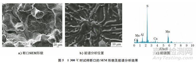 用掃描電鏡及能譜儀對(duì)不同脆性溫度區(qū)的拉伸試樣斷口進(jìn)行分析。第一類脆性溫度區(qū)為高溫區(qū),也稱為熔點(diǎn)脆化區(qū)。在溫度大于1200℃時(shí),45鋼連鑄坯的塑性急劇下降。在高溫區(qū),斷口較平滑,呈液相凝固自由收縮特征,晶粒細(xì)小,沿晶界液膜處斷裂。溫度為1300℃時(shí)的試樣斷口SEM 形貌及能譜分析結(jié)果如圖5所示,高溫下斷口局部熔化,能譜分析可見(jiàn)斷口處分布著細(xì)小的MnS夾雜,高溫下微小的硫化物質(zhì)點(diǎn)在奧氏體晶界析出,在高溫拉伸過(guò)程中,這些質(zhì)點(diǎn)成為了拉伸開(kāi)裂的起裂源。