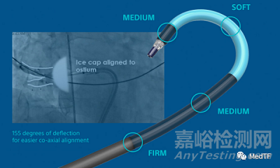 輸送鞘(POLARSHEATH)最大設(shè)計(jì)特點(diǎn)是彎曲角度達(dá)到155°(美敦力的FlexCath僅有135°),這將在消融右下肺靜脈變得順利。