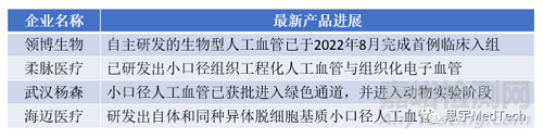 其中,領(lǐng)博生物自主研發(fā)的生物型人工血管已于2022年8月完成首例臨床入組;柔脈醫(yī)療已研發(fā)出小口徑組織工程化人工血管與組織化電子血管;武漢楊森研發(fā)的小口徑人工血管已獲批進(jìn)入綠色通道,并進(jìn)入動物實(shí)驗(yàn)階段;海邁醫(yī)療研發(fā)出了自體和同種異體脫細(xì)胞基質(zhì)小口徑人工血管。