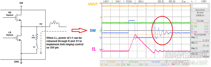 開關(guān)節(jié)點(diǎn)上的振鈴會導(dǎo)致EMI問題的出現(xiàn)。 器件的振鈴越多,EMI性能就越差(圖6)。 在SW和GND之間增加一個1k Ω電阻(R)和另一個開關(guān)(S1)可減輕振鈴。 在輕載的情況下,當(dāng)HS和LS開關(guān)均關(guān)斷時,S1導(dǎo)通,使L1的部分電流通過R和S1釋放到GND(圖7)。