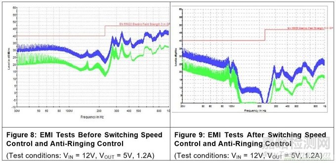 圖8和圖9展示了通過開關(guān)速度控制和防振鈴控制而實(shí)現(xiàn)的EMI降低。