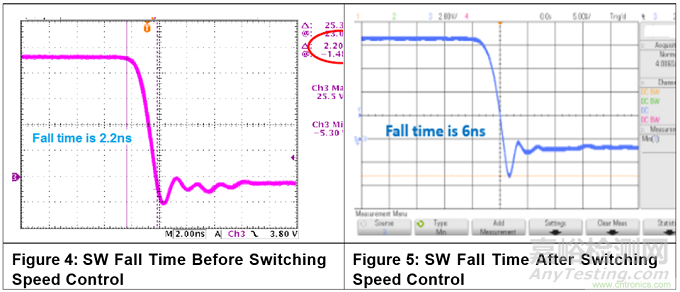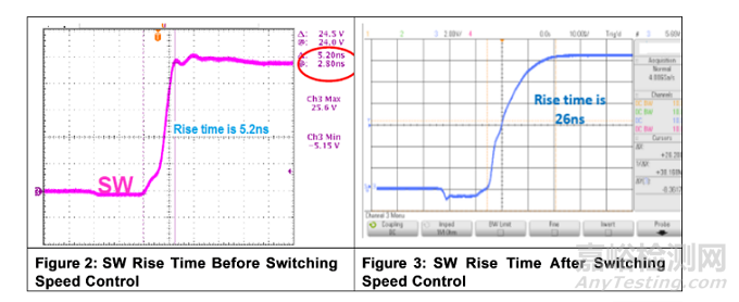 通過延長開關(guān)節(jié)點(diǎn)的開關(guān)上升時間和下降時間來降低dV / dt變化速率,從而減少了EMI(見圖2,圖3,圖4和圖5)。