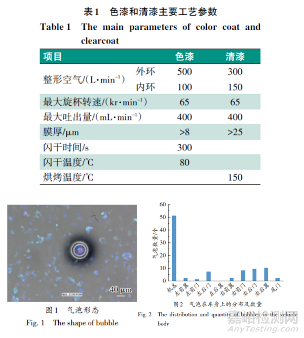 然后統(tǒng)計(jì)氣泡發(fā)生的部位和數(shù)量 (如圖2),發(fā)現(xiàn)氣泡分布不固定,整車垂直面和水平面都可能出現(xiàn),但水平面的氣泡數(shù)量明顯高于垂直面。為了快速確認(rèn)氣泡所在涂層,對(duì)氣泡部位進(jìn)行輕打磨并用顯微鏡逐層觀察確認(rèn),發(fā)現(xiàn)對(duì)清漆層輕打磨之后氣泡消失,打磨部位色漆層珠光排列與周圍珠光排列無(wú)差異,且未漏出深色底涂顏色,可以由此推斷氣泡處于色漆層之上。確認(rèn)珠光水性色漆的基礎(chǔ)噴涂參數(shù),噴房濕度為(75士5)%,溫度為 (25士2)C,風(fēng)速為0.3~04 m/s,色漆膜厚8~12 um,中涂膜厚30 um,清漆膜厚35 um,清漆烘烤時(shí)間20 min。為了盡快消除氣泡對(duì)生產(chǎn)開動(dòng)率的影響,在保證中涂和清漆膜厚不變的情況下,從色漆噴涂機(jī)器人參數(shù)設(shè)定、閃干爐和烘烤爐條件、涂料消泡性能這3個(gè)方向展開相關(guān)測(cè)試并分析原因,尋求消除氣泡的最佳方案。