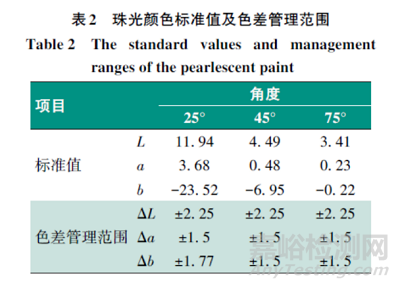 在靜電噴涂中,噴涂流量、旋杯轉(zhuǎn)速、成型空氣、高電壓等參數(shù)對(duì)涂膜的狀態(tài)和涂膜質(zhì)量都會(huì)產(chǎn)生一定的影響。由于成型空氣會(huì)對(duì)噴幅、涂膜的疊加次數(shù)產(chǎn)生影響,高電壓主要影響靜電噴涂的靜電效應(yīng)、上漆率、涂膜的均勻性等,這些工藝參數(shù)在機(jī)器人導(dǎo)入初期就已經(jīng)固化,考慮到生產(chǎn)線其他量產(chǎn)顏色的品質(zhì)穩(wěn)定性,這里暫不考慮調(diào)整成型空氣和高電壓參數(shù)的調(diào)整及影響,僅確認(rèn)噴涂流量和旋杯轉(zhuǎn)速對(duì)氣泡的影響。另外,由于噴涂流量和旋杯轉(zhuǎn)速會(huì)影響涂膜顏色,這里確認(rèn)氣泡消除的同時(shí)需要考慮參數(shù)調(diào)整對(duì)顏色的影響,此珠光漆的顏色標(biāo)準(zhǔn)值和色差管理基準(zhǔn)如表2所示。