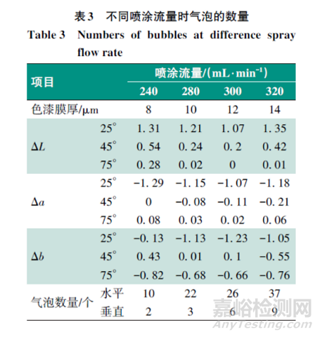 從表3可以看出,增大噴涂流量,色漆厚度隨之增大,顏色相對(duì)比較穩(wěn)定,但是水平面產(chǎn)生的氣泡數(shù)量明顯增多,垂直面的氣泡數(shù)量略增多。說(shuō)明噴涂流量越大越易產(chǎn)生氣泡,在顏色不受影響的情況下,需要盡量降低色漆膜厚。初步分析原因,隨膜厚增加,涂膜中溶劑和水分、氣泡逸出的時(shí)間變長(zhǎng),從而導(dǎo)致氣泡的產(chǎn)生。