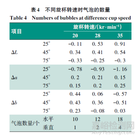 旋杯轉(zhuǎn)速主要影響涂料霧化效果、涂膜干濕度、涂料中珠光的排列方式,同時(shí)對(duì)涂膜顏色產(chǎn)生影響。控制色漆膜厚為10 um,通過(guò)設(shè)定不同旋杯轉(zhuǎn)速,確認(rèn)氣泡改善情況和色差,結(jié)果見表4。