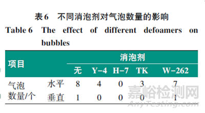 在色漆中添加1%不同種類消泡劑,控制色漆膜厚為8um,按照上述最優(yōu)工藝條件噴涂A4測(cè)試板,即噴涂流量240 mL/min,旋杯轉(zhuǎn)速20 kr/min,閃干溫度90°C,烘烤溫度140C,測(cè)試結(jié)果見表6。