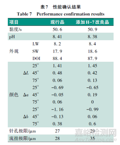 由表6可知,H-7的消泡效果最好,而Y-4、TK、W262對(duì)氣泡消除有一定作用,但無(wú)法完全消除氣泡。分析原因:消泡劑是一種表面活性劑,添加一定量的消泡劑可以改善涂料的表面張力、成膜過(guò)程中濕膜的表面張力梯度和濕膜表層的表面張力均勻化能力。同時(shí),助劑的添加會(huì)對(duì)涂料溶劑揮發(fā)、溶解性能、流平性等其他性能產(chǎn)生影響,因此需要同時(shí)確認(rèn)添加后涂料黏度 (福特4號(hào)黏度杯)、pH、干膜外觀、顏色及抗針孔、流掛性等作業(yè)性和生產(chǎn)適應(yīng)性能。添加H-7類型消泡劑后性能確認(rèn)結(jié)果如表7所示,各項(xiàng)性能基本無(wú)劣化影響。