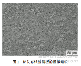 試驗(yàn)材料為艦船用低碳高強(qiáng)鋼,其實(shí)測(cè)化學(xué)成分(質(zhì)量分?jǐn)?shù)/%)為0.01C,0.22Si,1.95Mn,1.90Cu,0.45Cr,0.55Mo,2.20Ni,余Fe。使用50kg真空感應(yīng)爐冶煉試驗(yàn)鋼并澆鑄成鑄坯,鑄坯尺寸為150mm×150mm×300mm。使用馬弗爐將鑄坯在氬氣保護(hù)下加熱至1250℃保溫3h,使鑄坯成分均勻化。使用液壓機(jī)將鑄坯鍛造成截面尺寸為40mm×40mm的方坯。使用二輥軋機(jī)將方坯通過(guò)5道次熱軋成厚度為12mm的鋼板,壓下量分別為 50.0,37.5,28.1,21.1,15.8,12.0mm,每道次壓下率為25%,開(kāi)軋溫度為1150℃,終軋溫度為800℃。熱軋態(tài)試驗(yàn)鋼板的顯微組織為多邊形鐵素體,如圖1所示。