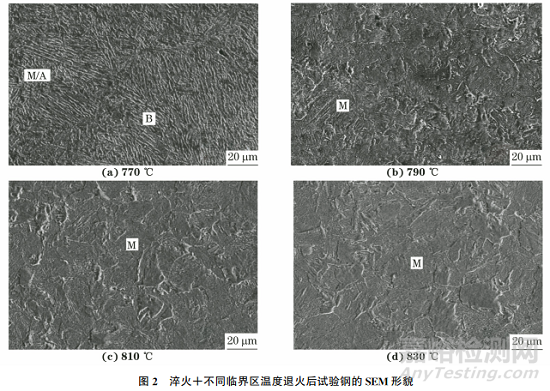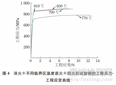 (2)經(jīng)淬火+臨界區(qū)退火+回火處理后,當(dāng)臨界區(qū)退火溫度由770℃升高到790℃時(shí),試驗(yàn)鋼的屈服強(qiáng)度和抗拉強(qiáng)度增大,斷后伸長(zhǎng)率減?。划?dāng)臨界區(qū)退火溫度為790,810,830℃時(shí),試驗(yàn)鋼的屈服強(qiáng)度、抗拉強(qiáng)度和斷后伸長(zhǎng)率相近。