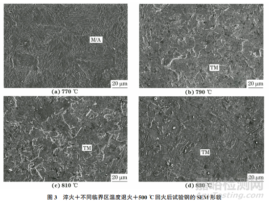 由圖3可見(jiàn),經(jīng)過(guò)淬火+不同溫度臨界區(qū)退火+500℃回火后,試驗(yàn)鋼中馬氏體和貝氏體發(fā)生回復(fù),轉(zhuǎn)變成回火馬氏體(TM)和貝氏體,其顯微組織由回火馬氏體、貝氏體、少量M/A島和鐵素體組成。隨著臨界區(qū)退火溫度的升高,試驗(yàn)鋼中的板條狀組織逐漸減少,經(jīng)過(guò)回復(fù)的板條馬氏體和貝氏體,組織趨于合并而呈塊狀特征,兩者的界面變得模糊甚至消失。