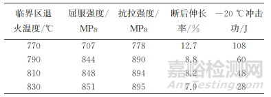 表1 淬火+不同臨界區(qū)溫度退火+回火后試驗(yàn)鋼的力學(xué)性能