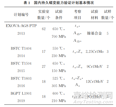 2014年,在全國(guó)首次組織開(kāi)展了持久蠕變?cè)囼?yàn)實(shí)驗(yàn)室間比對(duì)活動(dòng)。2015年,能力驗(yàn)證擴(kuò)項(xiàng)成功,寶山鋼鐵股份有限公司中央研究院成為國(guó)內(nèi)首家獲得持久蠕變?cè)囼?yàn)?zāi)芰︱?yàn)證提供者資質(zhì)的單位。之后先后3次組織開(kāi)展了持久蠕變?cè)囼?yàn)?zāi)芰︱?yàn)證活動(dòng),參與的實(shí)驗(yàn)室分別來(lái)自冶金、航空航天、電力、科研院所以及專業(yè)檢測(cè)機(jī)構(gòu)等行業(yè)及單位,考察項(xiàng)目包括持久斷裂時(shí)間tu、斷后伸長(zhǎng)率Au與斷面收縮率Zu。目前,國(guó)內(nèi)組織及參與的持久蠕變能力驗(yàn)證計(jì)劃基本情況如表1所示(表中A4D、A5D分別為標(biāo)距為4,5倍直徑的斷后伸長(zhǎng)率)。