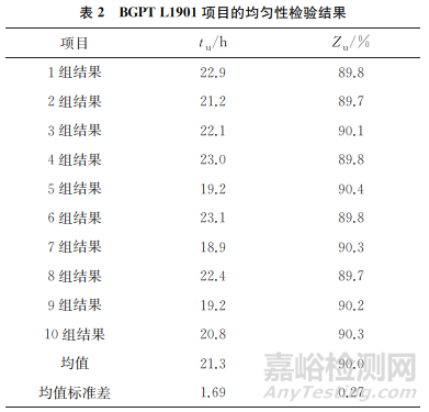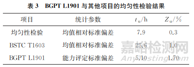 根據(jù)ISO13528:2015《實(shí)驗(yàn)室間比對(duì)的能力驗(yàn)證統(tǒng)計(jì)方法》,對(duì)能力驗(yàn)證試樣均進(jìn)行了有效的均勻性檢驗(yàn)。均勻性檢驗(yàn)的具體操作流程為隨機(jī)抽取20根試樣,組成10組進(jìn)行試驗(yàn),以每組試樣測(cè)試結(jié)果的平均值參與均勻性統(tǒng)計(jì)。均勻性檢驗(yàn)統(tǒng)計(jì)結(jié)果需滿足兩個(gè)條件:① 各指標(biāo)的均值相對(duì)標(biāo)準(zhǔn)偏差小于上一次同類型的能力驗(yàn)證計(jì)劃的均值相對(duì)標(biāo)準(zhǔn)偏差的1/3;②各指標(biāo)的均值標(biāo)準(zhǔn)偏差小于能力驗(yàn)證計(jì)劃的能力評(píng)定標(biāo)準(zhǔn)偏差的1/3。只有同時(shí)滿足這兩個(gè)條件,才能表明能力驗(yàn)證試樣的不均勻性對(duì)于實(shí)驗(yàn)室評(píng)價(jià)結(jié)果的影響可以忽略,均勻性檢驗(yàn)才有效。表2及表3分別為BGPT L1901項(xiàng)目與其他項(xiàng)目的均勻性檢驗(yàn)結(jié)果,可以看出,BGPT L1901項(xiàng)目的均勻性檢驗(yàn)結(jié)果滿足上述兩個(gè)條件,表明該次能力驗(yàn)證所用試樣具有較好的均勻性。