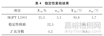 對(duì)采用同材料加工的留存樣均進(jìn)行了穩(wěn)定性檢驗(yàn)。以BGPT L1901項(xiàng)目為例,2019年3月該計(jì)劃能力驗(yàn)證試樣完成加工,2021年3月隨機(jī)抽取該計(jì)劃留存樣進(jìn)行穩(wěn)定性復(fù)檢,復(fù)檢結(jié)果顯示指標(biāo)均為滿意結(jié)果(見(jiàn)表4,表中Xtu為持久斷裂時(shí)間的指定值,σtu為持久斷裂時(shí)間的能力評(píng)定標(biāo)準(zhǔn)偏差;Xzu為斷面收縮率的指定值,σzu為斷面收縮率的能力評(píng)定標(biāo)準(zhǔn)偏差),這表明采用的能力驗(yàn)證材料屬于無(wú)時(shí)效鋼鐵產(chǎn)品,性能不隨時(shí)間變化,不對(duì)試驗(yàn)結(jié)果產(chǎn)生影響。