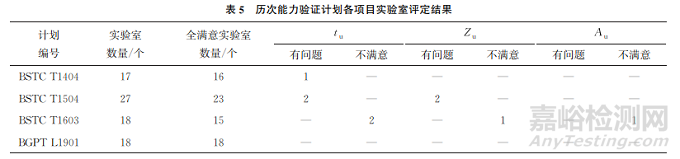 自2014年以來(lái),共組織了4次金屬材料持久蠕變?cè)囼?yàn)的實(shí)驗(yàn)室比對(duì)、能力驗(yàn)證活動(dòng)。共有80家實(shí)驗(yàn)室參與了該技術(shù)領(lǐng)域的比對(duì)或能力驗(yàn)證活動(dòng),其中72家實(shí)驗(yàn)室獲得滿意結(jié)果證書(shū),8家未獲得全部滿意結(jié)果,其中有5家實(shí)驗(yàn)室因?yàn)槌志脭嗔褧r(shí)間偏差較大而未獲得滿意結(jié)果,3家斷面收縮率未獲得滿意結(jié)果,1家蠕變斷后伸長(zhǎng)率未獲得滿意結(jié)果,歷次能力驗(yàn)證計(jì)劃各項(xiàng)目實(shí)驗(yàn)室評(píng)定結(jié)果如表5所示。