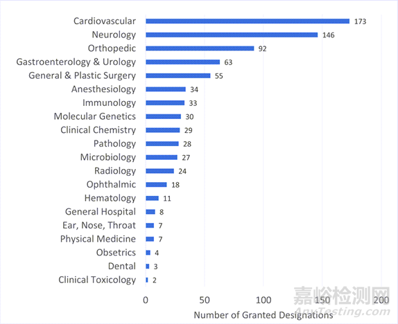 從突破性器械認(rèn)定結(jié)果來(lái)看,心血管類(lèi)器械獲得認(rèn)定數(shù)量最多。心血管類(lèi)器械以173個(gè)認(rèn)定數(shù)量領(lǐng)先,而神經(jīng)病學(xué)小組以146個(gè)緊隨其后。其他獲得突破性認(rèn)定的器械包括骨科、消化內(nèi)科和泌尿外科、普通外科和整形外科等。