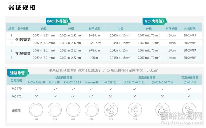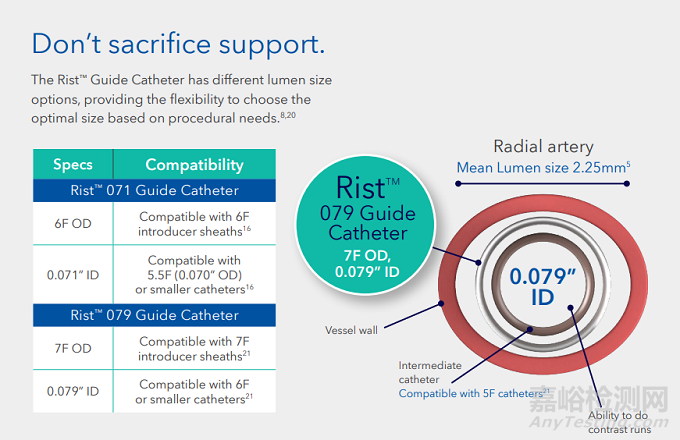 Rist導(dǎo)管可以與適配的選擇性導(dǎo)管組成一個完整的系統(tǒng),其可以為臨床醫(yī)生提供多種選擇組合;如下圖所示,Rist 071導(dǎo)管外徑為6F,與6F鞘管相適配,導(dǎo)管內(nèi)徑為0.071'',其在使用時可以配合0.070''或更小的導(dǎo)管;Rist 079導(dǎo)管外徑為7F,與7F鞘管相適配,導(dǎo)管內(nèi)徑為0.079'',其在使用時可以配合6F或更小的導(dǎo)管;
