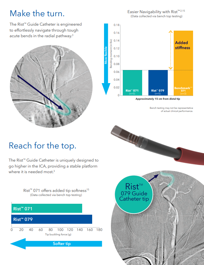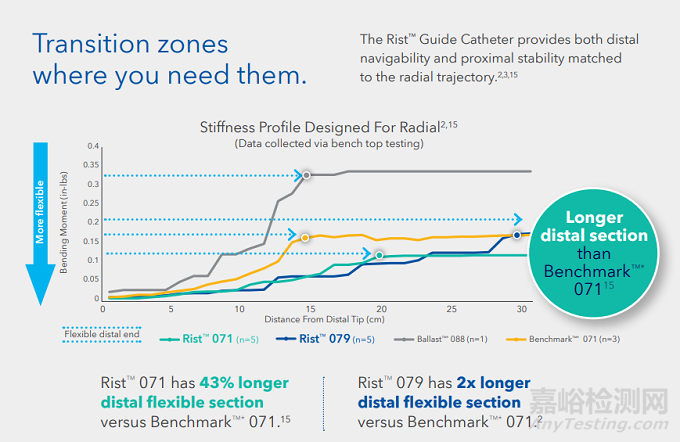圖中展示的是Rist 071和Rist 079與Ballast 088與Benchmark 071遠端柔順性的臺架測試對比結(jié)果,結(jié)果顯示在這四款產(chǎn)品中,Rist 071導(dǎo)管遠端柔軟段比Benchmark 071長43%左右,Rist 079導(dǎo)管遠端柔軟段是Benchmark 071的兩倍,Rist導(dǎo)管擁有更長的遠端柔軟段以及良好的過渡段,這為其通過迂曲血管解剖提供了必要的前提條件;
