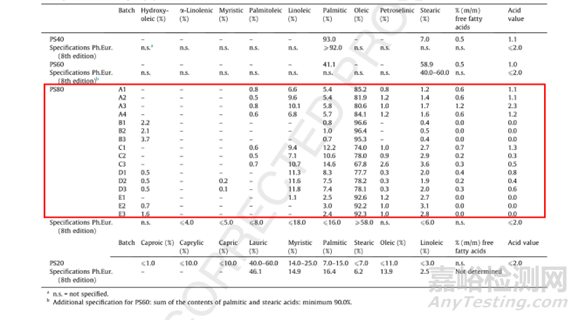 聚山梨醇酯是由不同脂肪酸酯組成的多相混合物,中國(guó)藥典要求聚山梨酯80和聚山梨酯20中的油酸含量范圍分別為不低于58.0%,月桂酸應(yīng)為40.0%~60.0%之間。一份數(shù)據(jù)顯示,不同供應(yīng)商間不同批次(A1-E3)聚山梨酯80均有差異(表2)。