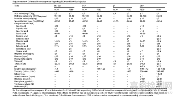 研發(fā)生產(chǎn)過(guò)程中應(yīng)考慮到產(chǎn)品輔料本身對(duì)產(chǎn)品的的影響,以確保最終產(chǎn)品的安全有效性,各國(guó)藥典要求市售產(chǎn)品必須滿足其最低標(biāo)準(zhǔn)才可允許其銷(xiāo)售(表3)。表1表明產(chǎn)品中聚山梨酯的實(shí)際使用量較低,實(shí)際采購(gòu)時(shí)應(yīng)該考慮到訂購(gòu)量的問(wèn)題以防發(fā)生輔料變質(zhì)問(wèn)題。