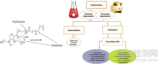 除聚山梨酯原料之外,聚山梨酯本身也存在著降解風(fēng)險(xiǎn)而造成其中含有的物質(zhì)更加復(fù)雜。通常而言,聚山梨酯有酸/堿/酶催化的水解風(fēng)險(xiǎn)以及包括金屬離子在內(nèi)造成的氧化降解風(fēng)險(xiǎn),聚山梨酯暴露于空氣、光和過(guò)渡金屬是導(dǎo)致其氧化的已知因素,酶介導(dǎo)的水解(一般由宿主蛋白介導(dǎo))被認(rèn)為是在生物藥中觀察到的降解的主要原因。抗體類(lèi)產(chǎn)品使用的溶媒一般是生理鹽水或者無(wú)菌注射用水,聚山梨酯的降解產(chǎn)物中的游離脂肪酸溶解度差,是形成不溶性顆粒的的主要原因之一。