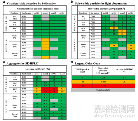 Grapentin C等人研究了四種單抗在含有聚山梨酯或P188不同液體配方的玻璃瓶中穩(wěn)定性,發(fā)現(xiàn)P188在脅迫(凍融、搖動(dòng))條件下提供與聚山梨酯相當(dāng)?shù)谋Wo(hù)效果(圖5)。
