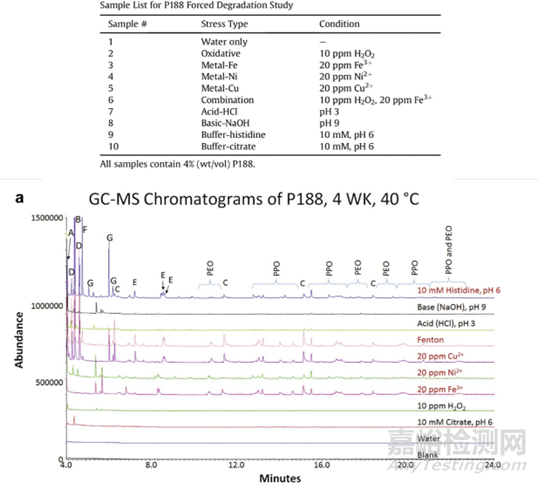 Wang T等人研究表明,P188在組氨酸緩沖體系中的穩(wěn)定性表現(xiàn)不如檸檬酸緩沖體系,金屬離子的存在下,穩(wěn)定型也變得比較差(圖6)。GC-MS鑒定的物質(zhì)包括P188的典型自氧化產(chǎn)物乙酸、乙二醇及其低聚物和醇類(lèi)、丙二醇及其低聚物和醇類(lèi)以及各種乙二醇酯和丙二醇酯。此外,還觀察到一些PPO和PEO低聚物,這些降解產(chǎn)物對(duì)不同蛋白質(zhì)配方的影響還需要進(jìn)一步研究。