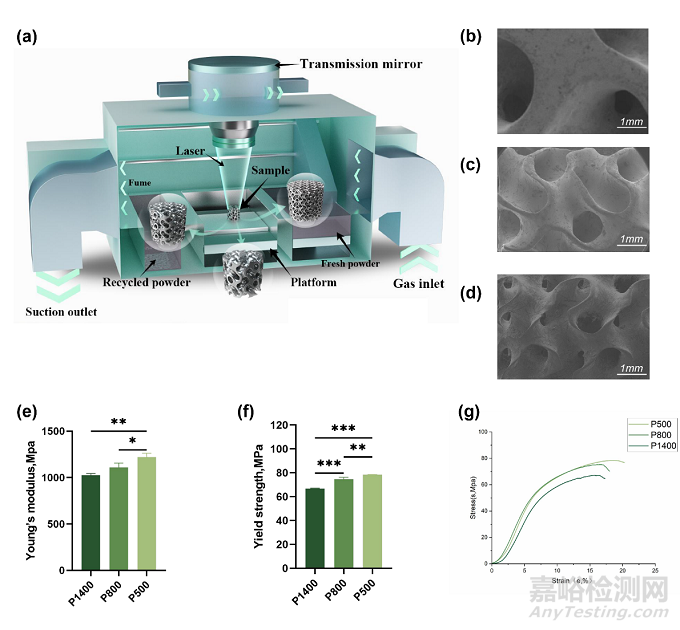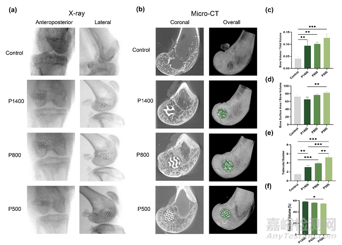 研究團(tuán)隊(duì)制備了孔徑分別為 500、800 和 1400 微米(P500,P800 和 P1400)的鎂合金支架。不同孔徑的鎂合金支架表面形貌類似,均無明顯缺陷(圖3b-d)。然而,不同孔徑的鎂合金支架的體外力學(xué)行為存在明顯差異,其中P500結(jié)構(gòu)性能表現(xiàn)良好。(圖3e-g)