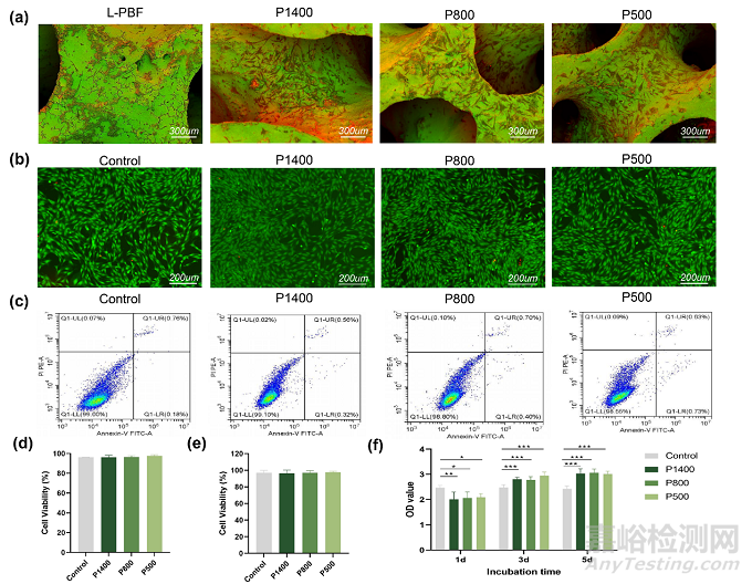 圖4:不同孔徑的鎂合金支架組的體外細(xì)胞黏附性(a)和生物相容性測(cè)試(b-f)