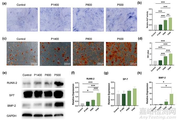 圖5:不同孔徑的鎂合金支架組體外促成骨能力測(cè)試:(a)堿性磷酸酶染色和(b) 堿性磷酸酶活性測(cè)試,(c-d)茜素紅染色及其半定量分析,(e-h) 成骨相關(guān)分子蛋白半定量分析結(jié)果