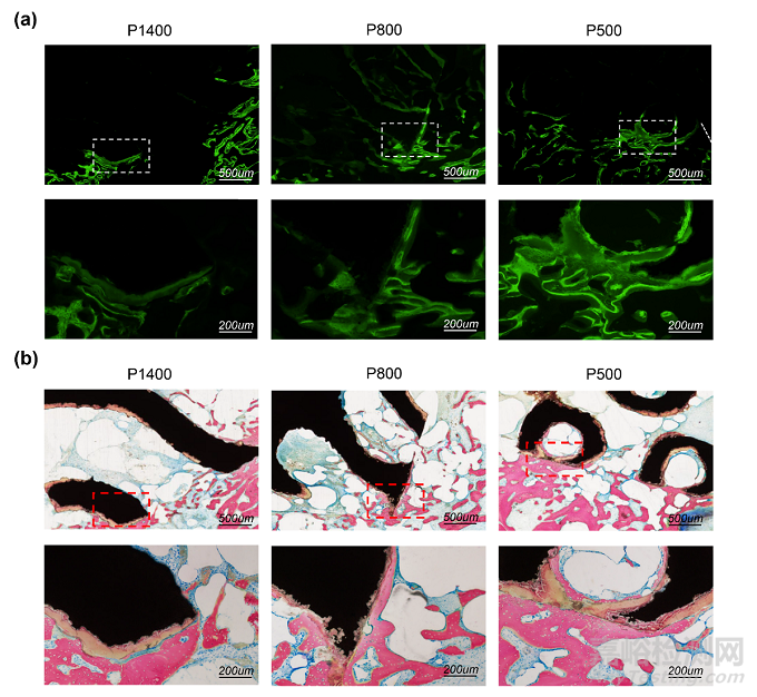 為了研究不同孔徑的鎂合金支架體內(nèi)生物降解行為及促成骨能力,研究團(tuán)隊(duì)進(jìn)一步建立了兔股骨髁缺損模型,硫酸鈣骨水泥作為對(duì)照。WE43多孔支架結(jié)構(gòu)在手術(shù)后4周仍然清晰可見,表明支架沒有明顯降解,具有良好的結(jié)構(gòu)完整性。在骨水泥組,硫酸鈣骨水泥完全降解(圖6a)。Micro-CT 結(jié)果顯示鎂合金支架組新骨形成量明顯高于對(duì)照組,并且P500組的 BV/TV,BSA/BV 和 Tb.N 值顯著高于 P800和 P1400組(圖6b-e) ,表明 P500支架成骨性能優(yōu)越,較為持久的整理力學(xué)支撐有利于圍關(guān)節(jié)骨缺損的修復(fù),具有作為骨科植入物的潛力。對(duì)缺損部位進(jìn)行硬組織切片的結(jié)果也與Micro-CT 結(jié)果相吻合(圖7)。
