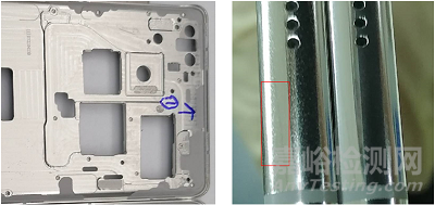 該手機(jī)中框制程:鋁擠料→粗加工→納米注塑→CNC→拋光→陽極。試樣3D面上出現(xiàn)較多的亮斑/發(fā)黃,如圖1所示,不良比例3~5%,產(chǎn)品退鍍后陽極試樣表面依舊發(fā)黃,表面呈現(xiàn)為麻面。為此實(shí)驗(yàn)室與現(xiàn)場配合,找出了陽極發(fā)亮異常的原因,指導(dǎo)制程針對性改善。