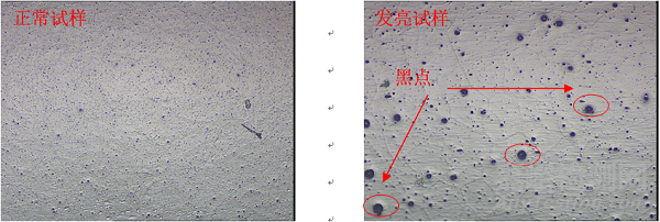 正常試樣表面光滑,僅在局部區(qū)域存在小黑點(diǎn),而發(fā)亮試樣有較多的大尺寸黑點(diǎn),與目視亮點(diǎn)相似。