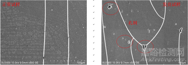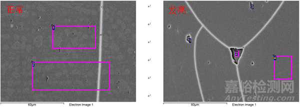 發(fā)亮試樣表面存在較多的尺寸大小不一的孔洞,最大孔~15 μm,孔洞內(nèi)有殘留異物,其成分主要含有Al、Fe、Si、Mn等,其整體數(shù)量及尺寸均要比正常嚴(yán)重,應(yīng)是這些孔洞造成的目視亮斑。