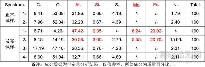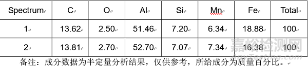 夾雜物成分含有Al、Si、Mn、Fe,與發(fā)亮試樣的坑洞內(nèi)殘留異物成分一致,可以推斷應(yīng)是試樣不耐腐蝕,其夾雜物在陽極制程中不耐腐蝕,被腐蝕掉,形成凹坑而形成目視的亮斑。