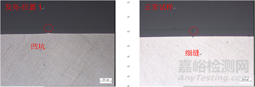 凹坑與細(xì)縫位置很有可能是夾雜物在陽極制程中被腐蝕掉形成的。