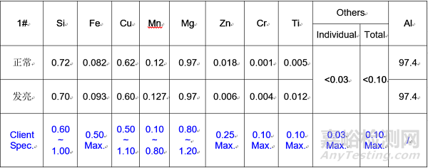 正常與發(fā)亮試樣的化學(xué)成分均符合Al 6013的客戶規(guī)格,但發(fā)亮試樣的鐵含量要高于正常試樣,意味著夾雜物數(shù)量要多于正常試樣。