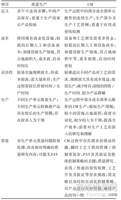 目前,生物制品尚無采用全 CM 工藝的產(chǎn)品上市,CM 技術(shù)在生物制品中的應(yīng)用仍處于起步階段。生物制品制備工藝流程主要包括上游培養(yǎng)、下游純化、病毒滅活等步驟。目的產(chǎn)物上游培養(yǎng)工藝采用的連續(xù)灌流生物反應(yīng)器是 CM 階段性上游工藝的典型代表,其已廣泛應(yīng)用于生物制品目的產(chǎn)物培養(yǎng),生產(chǎn)設(shè)備及質(zhì)量研究等均較為明確,技術(shù)較為成熟。生物制品下游純化、病毒滅活等工藝的CM仍處于發(fā)展階段,相應(yīng)技術(shù)處于研發(fā)狀態(tài),對(duì)生產(chǎn)設(shè)備、快速檢測(cè)技術(shù)、軟件開發(fā)及應(yīng)用、數(shù)據(jù)建模和自動(dòng)化處理、專業(yè)技術(shù)人才等方面提出了挑戰(zhàn)[15]。目前,尚無生物制品CM工藝開發(fā)、質(zhì)量研究等相關(guān)經(jīng)驗(yàn)可供借鑒參考,相關(guān)技術(shù)仍處于研發(fā)、優(yōu)化階段。批量制造模式與CM模式的技術(shù)優(yōu)勢(shì)及挑戰(zhàn)相關(guān)內(nèi)容匯總見表1[16?23]