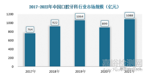 自新冠疫情出現(xiàn)后,民眾對自我健康的關注提升、口腔牙科消費預算有所增加。我國口腔牙科行業(yè)增長迅速,年復合增長水平較高。數(shù)據(jù)顯示,2021年我國口腔牙科行業(yè)市場規(guī)模為1088億元。