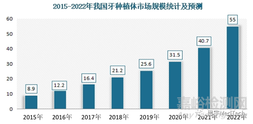 得益于民眾對自我健康的關注提升、口腔牙科消費預算有所增加,我國牙科種植體市場規(guī)模不斷增長。數(shù)據(jù)顯示,2021年我國牙科種植體市場規(guī)模從2015年的8.9億元增長到了40.7億元,2022年我國牙科種植體市場規(guī)模達55億元。