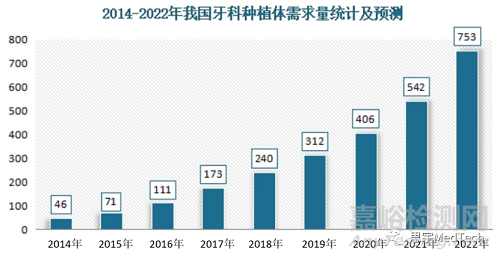 隨著牙科患者人數(shù)的增多,我國牙種植體需求量穩(wěn)定增長。根據(jù)數(shù)據(jù)顯示,2021年我國牙種植體需求量從2014年的46萬顆增長到了542萬顆,2022年我國牙種植體需求達到753萬顆。