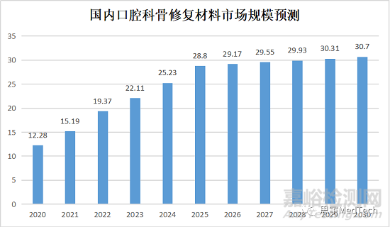 口腔科骨修復材料(骨粉)和口腔修復膜的應用場景主要為種植牙手術和頜面修復手術。骨修復材料在手術中的作用是用于骨量填充和骨缺失修補,口腔修復膜通常和前者聯(lián)合使用,用于口腔內(nèi)軟組織的淺層修復。2016-2019年,我國口腔修復膜市場規(guī)模由4.9億元增長至10.8億元,年復合增長率達到30.1%。預計2020-2025年期間,市場規(guī)模將保持25.0%的復合增速增長,預期在2025年將達到41.3億元。