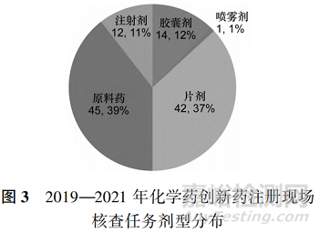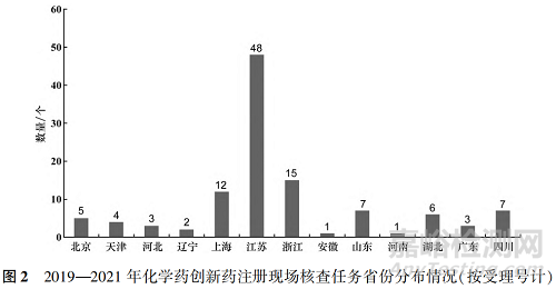 2019—2021 年,CFDI 共對(duì) NMPA 藥品審評(píng)中心(Center for Drug Evaluation of NMPA,CDE) 發(fā)起的114 個(gè)(按受理號(hào)計(jì),品種數(shù)為 55 個(gè))化學(xué)藥創(chuàng)新藥注 冊(cè) 核 查 任 務(wù) 進(jìn) 行 了 藥 學(xué) 研 制 和 生 產(chǎn) 現(xiàn) 場(chǎng) 核查[6 - 8]。其中 2019 年任務(wù)數(shù)為 15 個(gè)(按受理號(hào)計(jì)為 16 個(gè),品種數(shù)為 8 個(gè));2020 年任務(wù)數(shù)為 36 個(gè)(按受理號(hào)計(jì)為37 個(gè),品種數(shù)為20);2021 年任務(wù)數(shù)為 48 個(gè) (按受理號(hào)計(jì)為 61 個(gè),品種數(shù)為 27)。圖 1顯示,近 3 年化學(xué)藥創(chuàng)新藥的任務(wù)數(shù)量逐年遞增。因新舊法規(guī)過渡,上述任務(wù)包括按照 2007 年《藥品注冊(cè)管理辦法》 (局令 28 號(hào))受理的注冊(cè)申請(qǐng)核查任務(wù) 9 個(gè),2017 年 12 月《關(guān)于調(diào)整藥品注冊(cè)受理工作的公告》(2017 年第 134 號(hào))發(fā)布后集中受理的注冊(cè)申請(qǐng)核查任務(wù) 63 個(gè),2020 年《藥品注冊(cè)管理辦法》(國(guó)家市場(chǎng)監(jiān)督管理總局令第 27 號(hào))發(fā)布實(shí)施后受理的注冊(cè)申請(qǐng)核查任務(wù)42 個(gè)。圖2 顯示,在核查任務(wù)省份分布上,呈現(xiàn)出明顯的區(qū)域特性,主要集中在制藥大省,僅江蘇、浙江、上海三省市的化學(xué)藥創(chuàng)新藥的任務(wù)占比就達(dá)到了 65. 7% 。在圖 3 所示的劑型分布上,以普通的口服固體制劑及注射劑為主,片劑占比為 37% ,注射劑占比為 11% ,膠囊劑占比為 12% ,此外,原料藥占比最高,達(dá)到了 39% 。